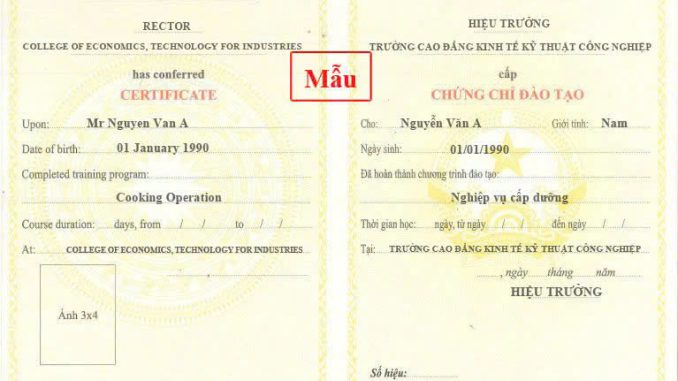 – Chứng chỉ được cấp bởi trường Cao Đẳng Kinh Tế Kỹ Thuật Công Nghiệp